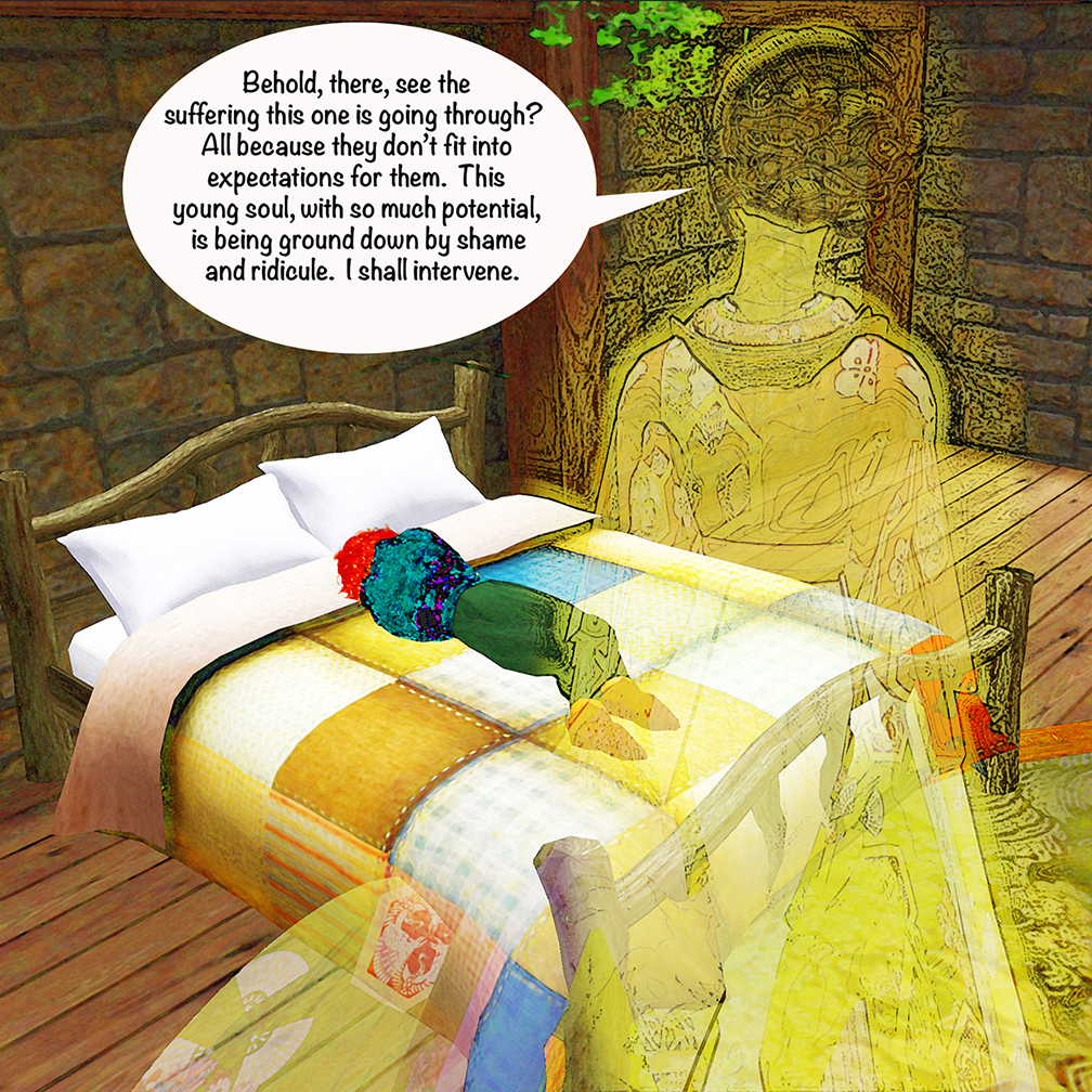 Transmute: Integration is a trans-positive fantasy graphic novel about a persona that is fractured so that they can be restored to wholeness. Chapter 1 introduces Loren.